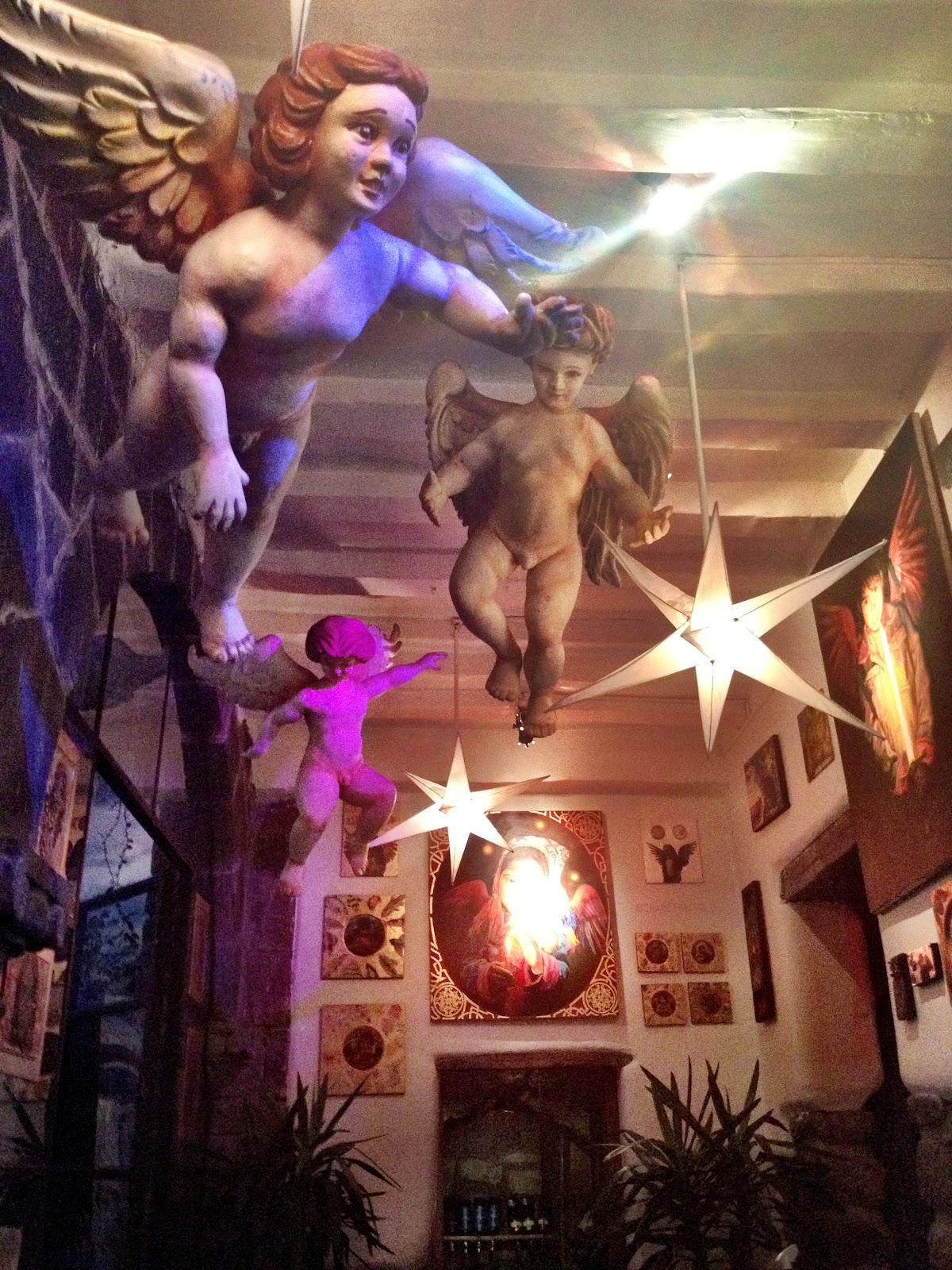 Step out of traditional and into the avant garde. Fallen Angel offers the most original dining experience in Cusco. Located in front of the luxurious Palacio Nazarenas Hotel, and next to the appraised Museum of Pre-Columbian Art (MAP), and the Nazarenas Plaza, Fallen Angel finds itself amidst the finest real estate of Cusco’s San Blas area. This trendy restaurant/bar/guesthouse is unlike anything else you will find in the Cusco area – a true visual art experience. As you step onto the premises of Fallen Angel you’ll be immediately captivated by the striking and original art/furniture. From Cherubs, to Flying Pigs, and even bathtub-aquarium tables, dining at Fallen Angel will make a lasting and contrasting experience to others in Cusco.
