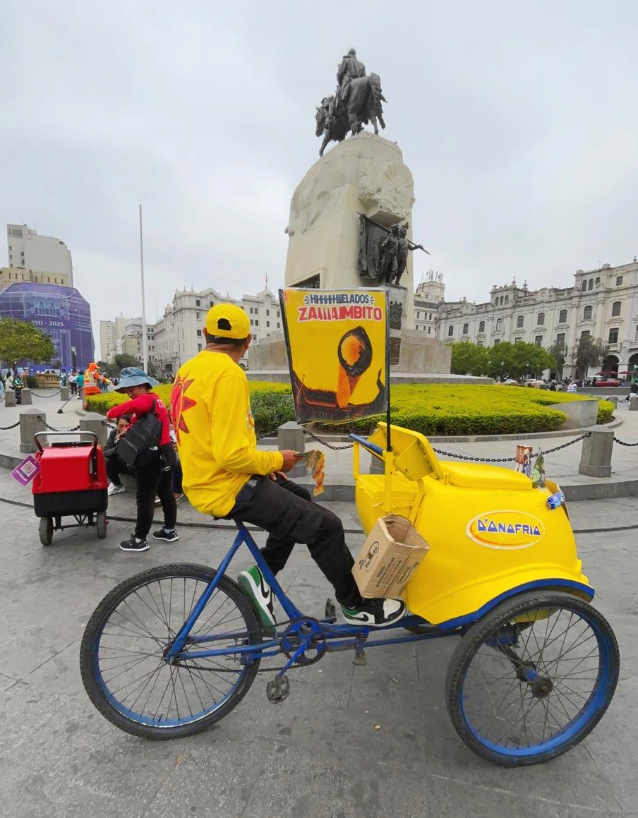 A classic Lima moment: grabbing a refreshing treat from an iconic yellow-clad ice cream vendor under the watchful gaze of Peru’s liberator.