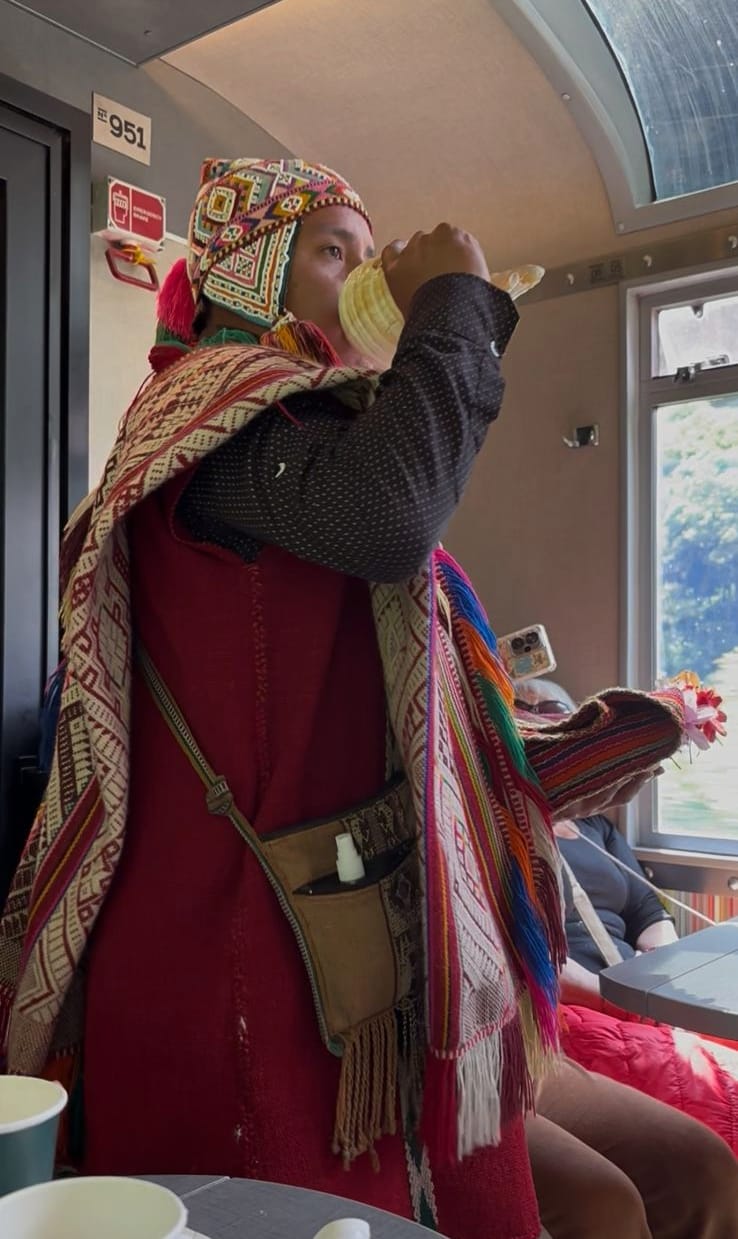 The journey is part of the destination as vibrant Saqra dancers perform in the aisles, bringing ancient Peruvian folklore to life.