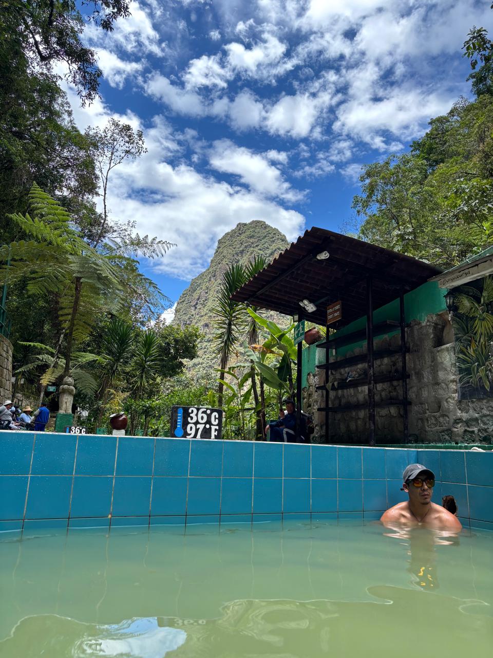 Aguas Calientes - meaning “hot waters,” after the famous hot springs here feels like a town built around a bustling market and a railway track, where trains, tourists, and local life all seem to meet in the same narrow streets. After breakfast that morning, my dad and I decided to check out the hot springs while my mom was resting inside the hotel. It’s not a long walk, but it’s one of those paths that quietly reminds you where you are - stone steps, small bridges, the river rushing somewhere below, and lush green mountains rising on every side. The further we walked, the quieter the town became. The souvenir shops slowly disappeared, replaced by tall trees, thick foliage, and the occasional sign pointing us toward the Baños Termales. Steam rising from the warm pools, travelers relaxing in the water, and the sound of the forest all around - the perfect way to unwind after Machu Pichhu.