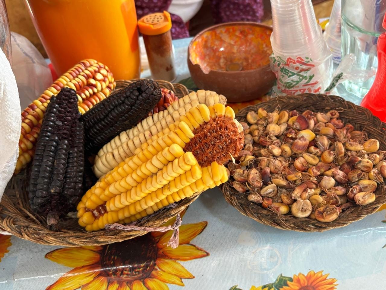 We also bought salt there, of course. One for food. One for body scrubbing, if I remember correctly. Because when in Maras, you apparently become the kind of person who buys artisanal Andean bath supplies with sincerity. On our way back, my dad discovered something he instantly approved of - Chicha, the traditional Andean corn drink. The version he tried was a deep reddish color and alcoholic, served in a simple plastic cup like it had been poured straight from the village kitchen. The lady selling it proudly showed us the different varieties of corn used to make it, which honestly looked like a small rainbow of maize.